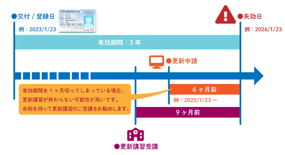 - 有効期間(※3)満了の9ヶ月前から更新講習を受講でき,6か月前から更新申請を行うことができます.
