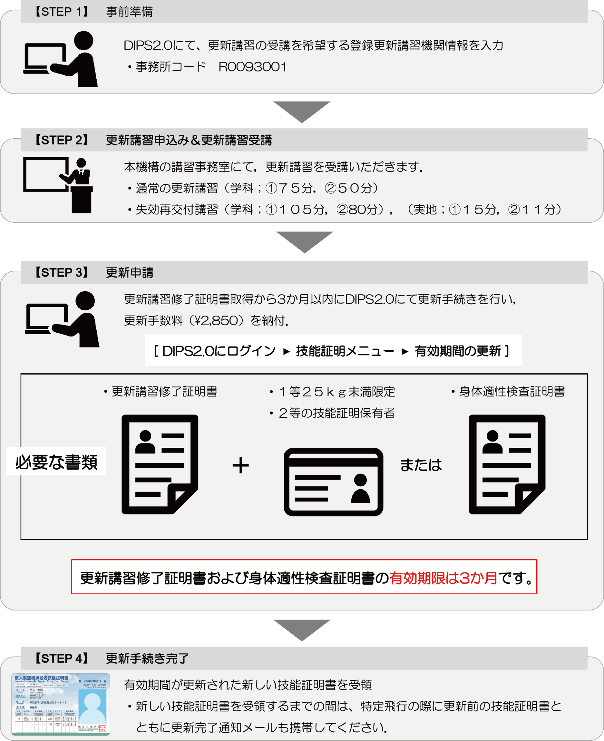 - 更新講習修了証明書の有効期限(※4)は3ヶ月です.なお,再発行による期限は延長されません.